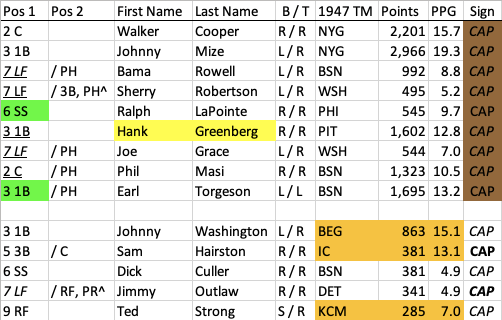Aries made the playoffs in 1947 thanks to a relatively unsung hero, with Cardinals third baseman Whitey Kurowski (2,341 / 16.0) serving as their offensive leader. While Kurowski and Emil “Dutch” Leonard (2,059 / 64.3) were their only 2,000 point scorers, consistency was key for the Rams: only two players in their lineup/rotation/bullpen scored less than 1,000 points on the year, and one of them was Hall of Fame catcher Ernie Lombardi (318 / 6.6), who will solidify the position for many years going reverse-chronologically. As far as Negro League reinforcements, third baseman/left fielder Lester Lockett (895 / 13.4), first baseman George Crowe (382 / 14.1), right fielder Pedro Formental (219 / 14.6) had great seasons from a points-per-game perspective.