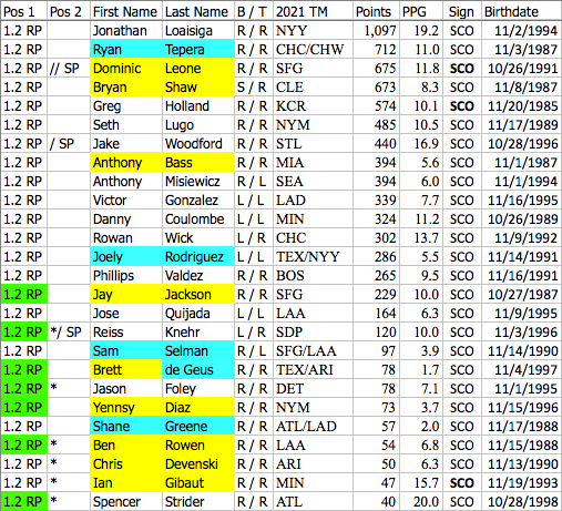 Seth Lugo has some experience starting, and could potentially be stretched out to fill a rotation spot in a hypothetical offseason tournament. Jake Woodford had more than five starts with the Cardinals, which is the cusp for me labeling pitchers relievers-with-an-asterisk. Anthony Bass pitched a lot for a Miami team that didn’t have need for a lot of high leverage innings. The same is true of Rowan Wick in Chicago, although he at least broke the 10 points-per-game threshold. Phillips Valdez almost reached that milestone for Boston, while Giants rookie Jay Jackson got it on the nose exactly.