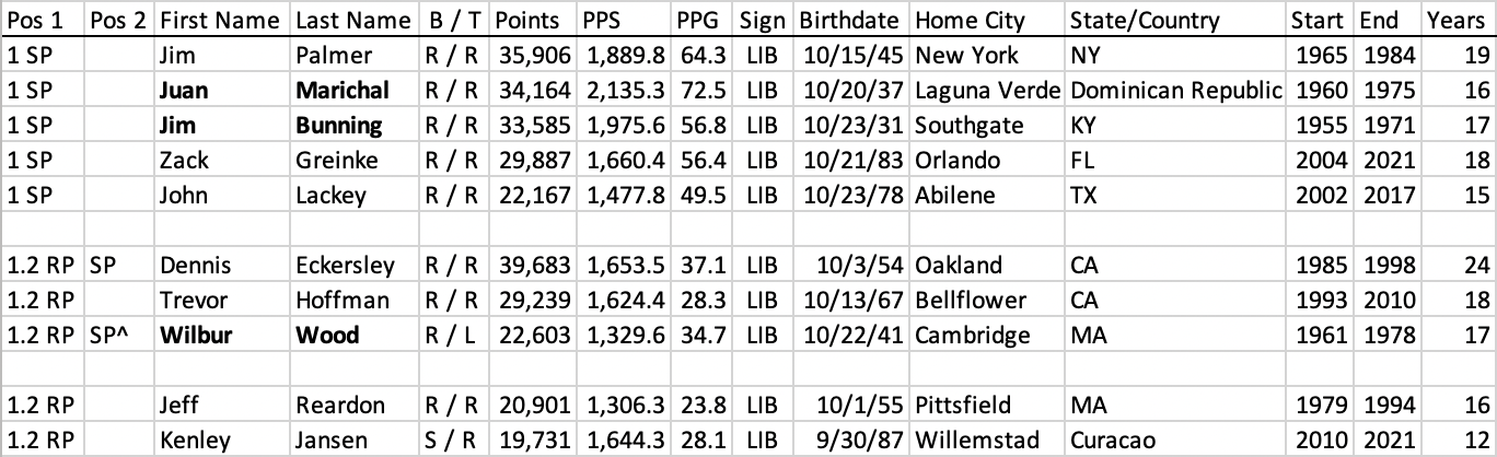 Not far behind Clemente in fantasy points is center fielder Vada Pinson (30,068), who takes over as the top Lions center fielder, in front of some guy named Mike Trout (22,478). Considering that Trout has just 11 seasons under his belt, compared to Pinson’s 18, it’s conceivable that the current Angel re-takes the top spot in the future. Leo also added two starting pitchers to their top seven: lefty Claude Osteen (24,996) clocks in at #4, while Andy Messersmith (21,325) has the third-highest points-per-game total among Leos with 62.0, behind just Roger Clemens (70.1) and Max Scherzer (70.5). Reliever Hoyt Wilhelm (28,950) only made one Leo team in the 70’s, but he beats out Billy Wagner (23,778) as the number one closer.