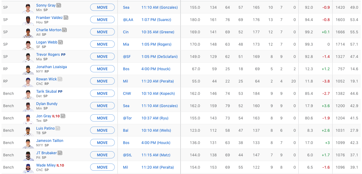 A very strong class of shortstops headlines this up and coming sign. The starting middle infield is made up of Jazz Chisholm Jr. and Dansby Swanson, with Whit Merrifield making use of his outfield eligibility. That alignment leaves Jake Cronenworth, Brandon Crawford, and Didi Gregorius on the bench… or competing for DH at-bats with bat-first type Luke Voit (depending on how much the rankings of the former players are wrapped up in SS eligibility).